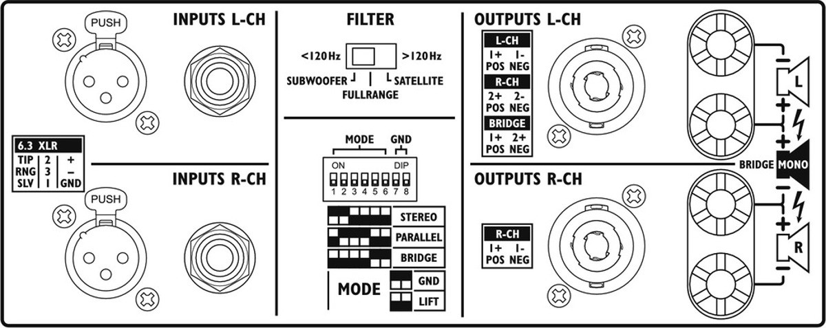 - Interne Frequenzweiche 120 Hz, 24 dB/Okt., umschaltbar Subwoofer-, Full Range- oder Satelliten-Betrieb